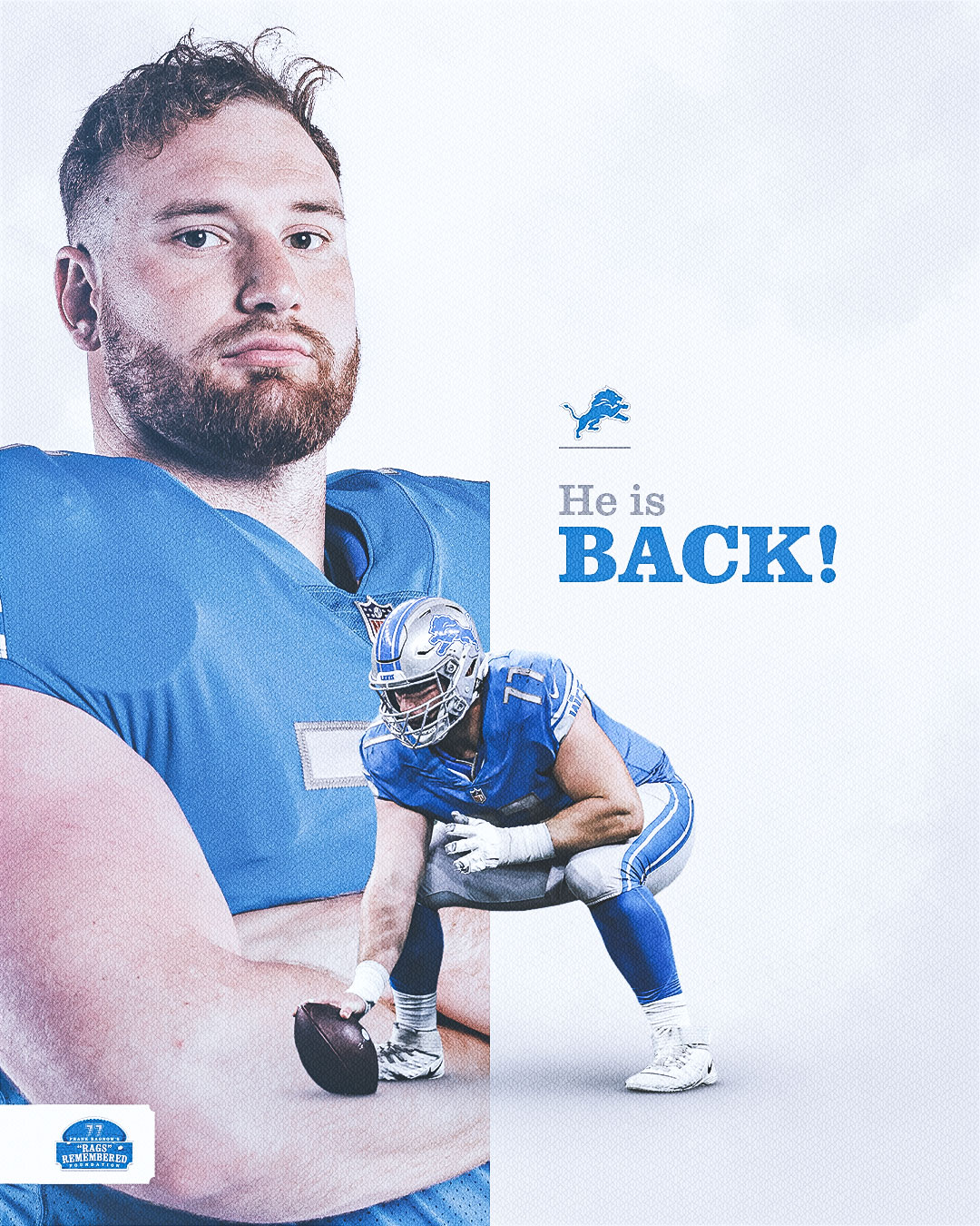 Ragnow's "Rags Remembered Foundation" announced Wednesday he's returning to the Lions, just in time for the all-important second half of the season.